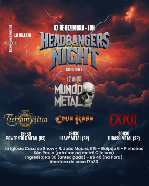 O underground brasileiro é reconhecido mundialmente por sua diversidade, autenticidade e paixão. E é justamente dessa união de forças que nasce o Headbangers Night, evento que promete ser um marco para a cena pesada nacional. No próximo dia 7 de dezembro, o La Iglesia, em São Paulo, receberá TierraMystica, Cova Rasa e Exkil — três nomes de peso do metal brasileiro — em uma noite de celebração, resistência e independência.