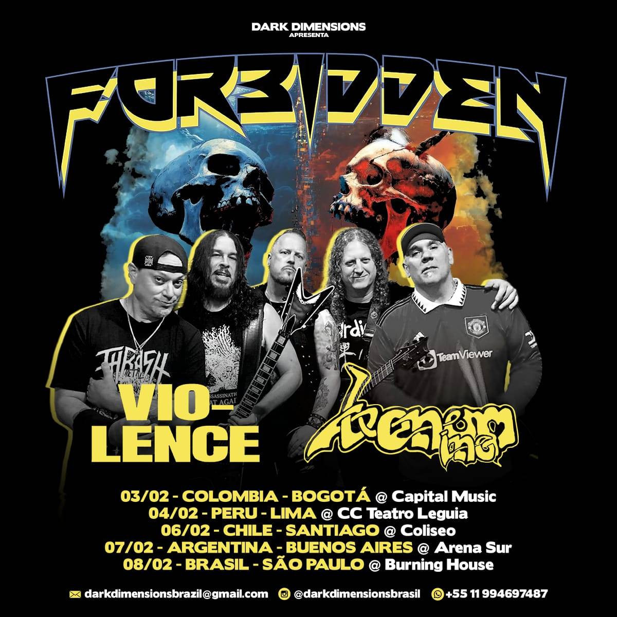 A produtora Dark Dimensions orgulhosamente anuncia uma turnê inédita pela América do Sul que reunirá em 2026 três nomes importantíssimos do metal e do thrash metal mundial: Forbidden, Vio-Lence e Venom Inc. Serão cinco datas confirmadas em países-chave da região, passando por Brasil, Argentina, Chile, Peru e Colômbia.