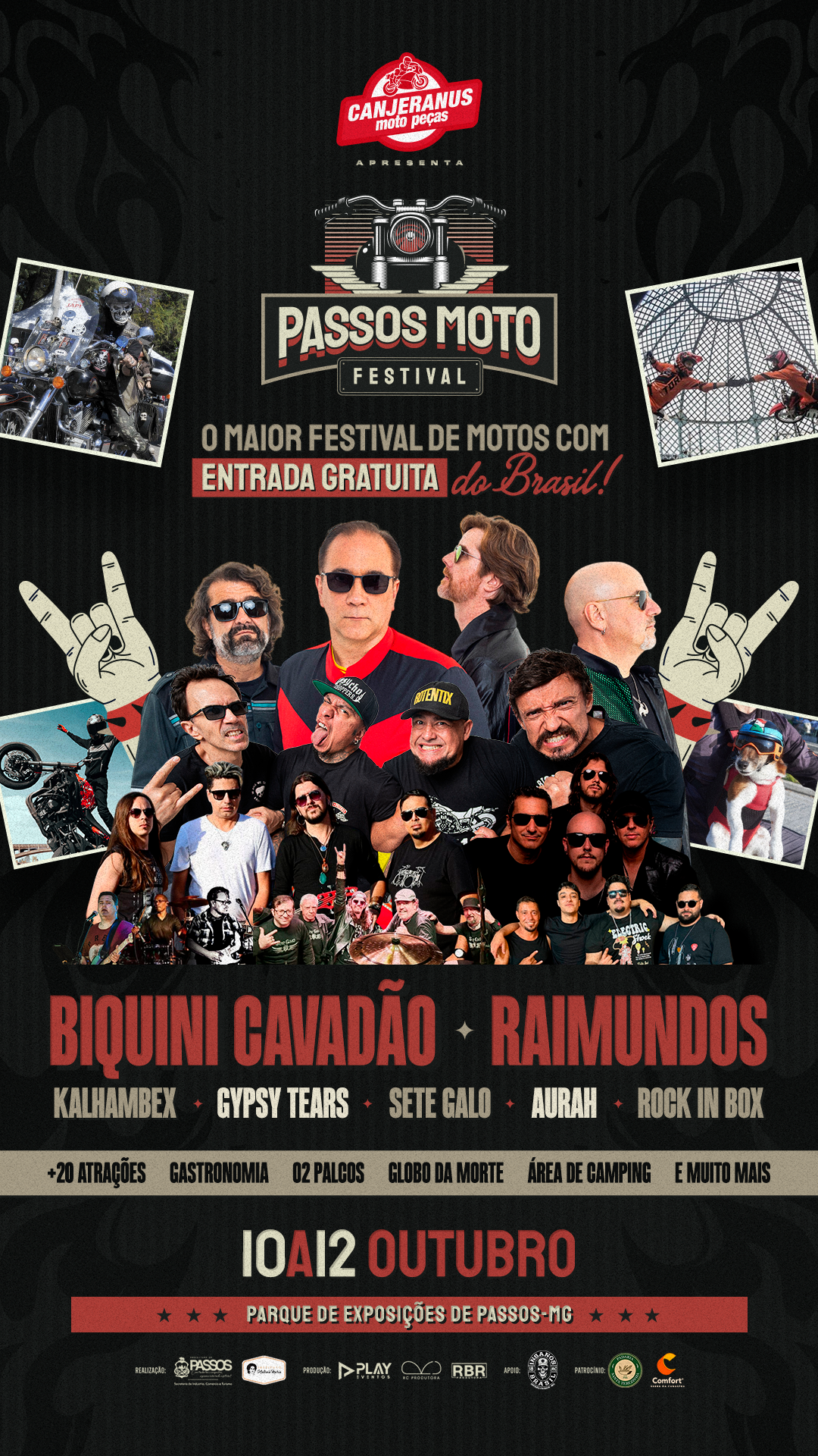 Nos dias 10, 11 e 12 de outubro, a cidade de Passos, no sul de Minas Gerais, será palco de um grande evento que promete movimentar os amantes do rock e do motociclismo. Além de receber motoclubes de todo o estado e até de outras regiões do país, a primeira edição do Passos Moto Festival será totalmente gratuita e trará nomes de peso do rock nacional, como Raimundos, Biquini Cavadão, Gypsy Tears, além de diversas outras bandas e atrações.