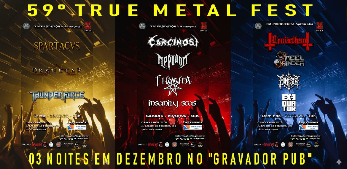 Nos dias 19, 20 e 21 de dezembro, o Gravador Pub recebe a 59ª edição do True Metal Fest, evento realizado pela TM Produtora que celebra a força e a diversidade do Metal underground. Serão 11 bandas, representando diferentes vertentes do gênero, em três noites dedicadas à música pesada. Além dos shows, o público poderá conferir exposições de lojas parceiras e, a cada noite, participar do sorteio de uma guitarra autografada por todos os guitarristas das bandas participantes.