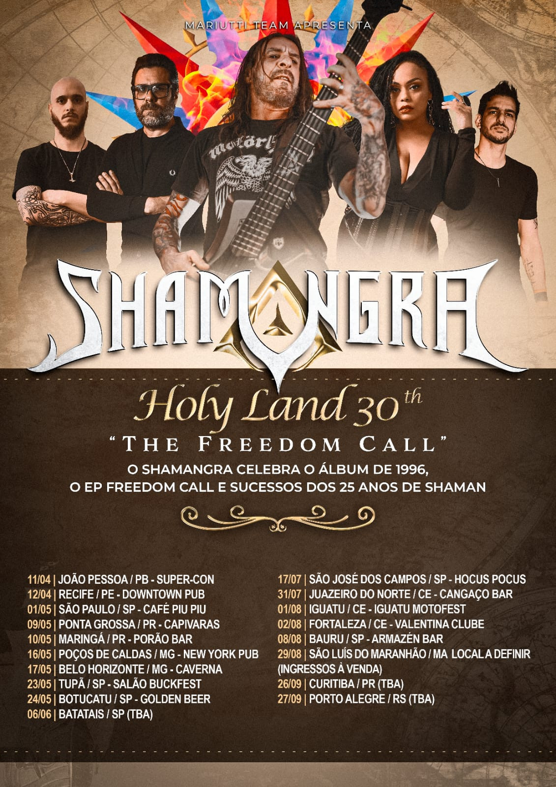 O Shamangra anunciou novas datas da turnê "Holy Land 30th – The Freedom Call", que celebra um dos momentos mais importantes da história do heavy metal brasileiro: os 30 anos do álbum "Holy Land", do Angra. Considerado um dos discos mais influentes do gênero no mundo, o trabalho marcou época ao unir heavy metal, música erudita e elementos da cultura brasileira em uma proposta estética inovadora e atemporal. As novas datas ampliam a turnê, levando o roteiro a cidades das regiões Sul, Sudeste e Nordeste do Brasil.