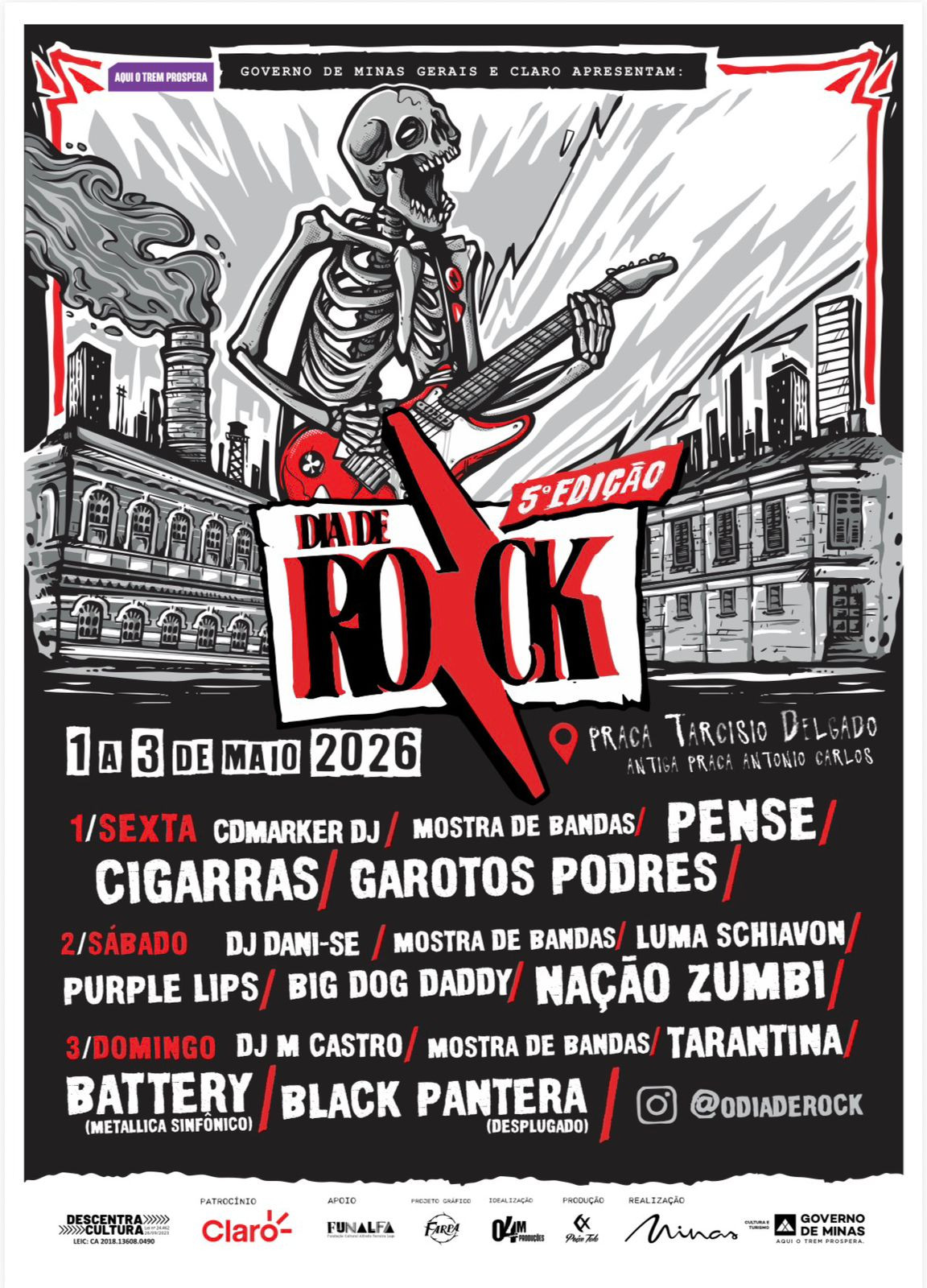 O Dia de Rock, festival que acontece em Juiz de Fora (MG), chega a 5ª edição e reúne artistas locais e nomes consolidados da música brasileira. Com programação gratuita, o evento acontece entre os dias 1º e 3 de maio, das 12h às 22h na Praça Tarcísio Delgado, no Centro da cidade.